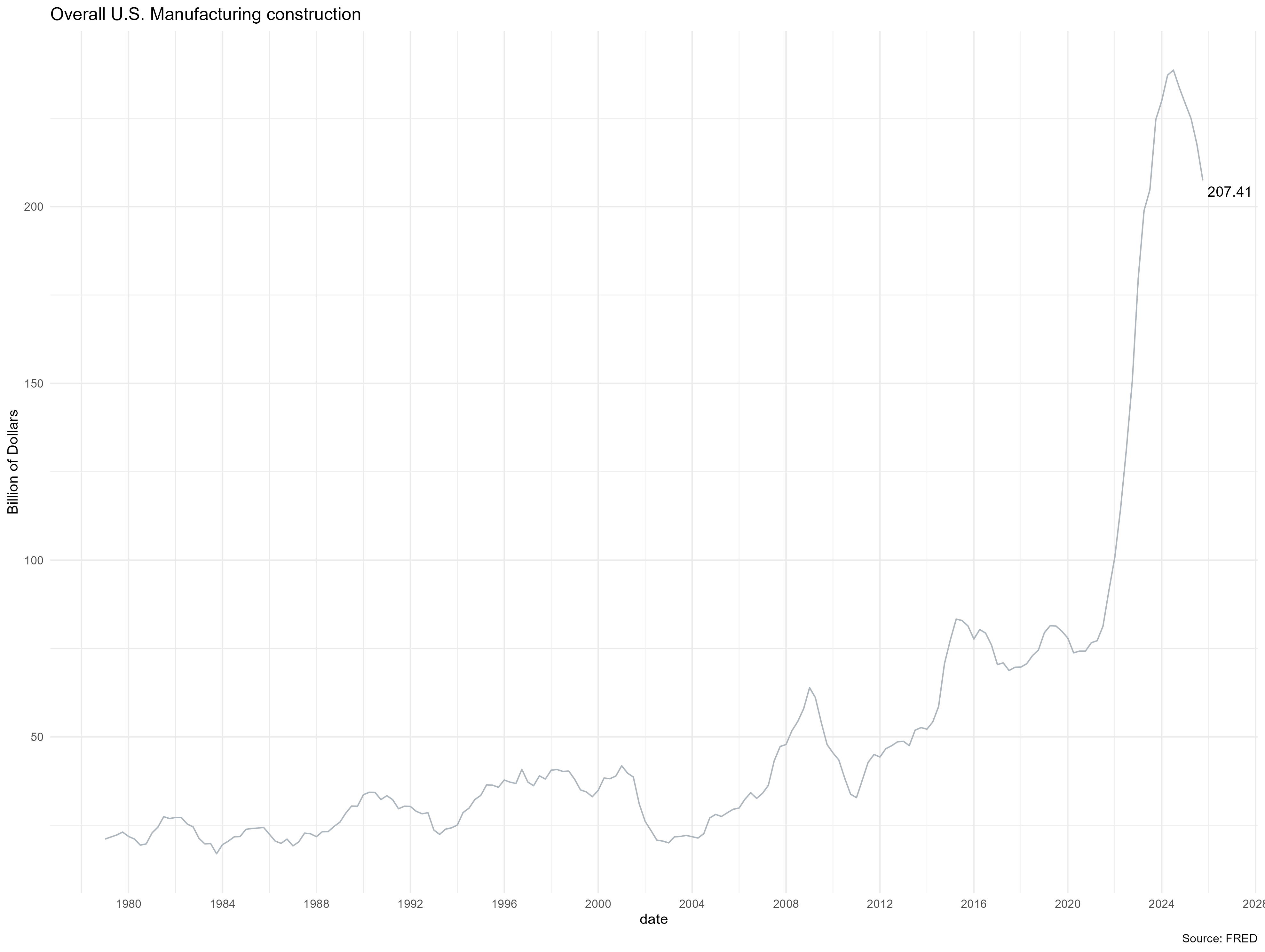 According to Bonvillian (2024) , different approaches were applied such as top down, bottom up, direct production support, demonstration projects, supply chain support, and regional implementation. The impact can be seen in the chart below (Overall U.S. Manufacturing construction), and also in the growth of investment in machinery and equipment(by brekdown of GDP).